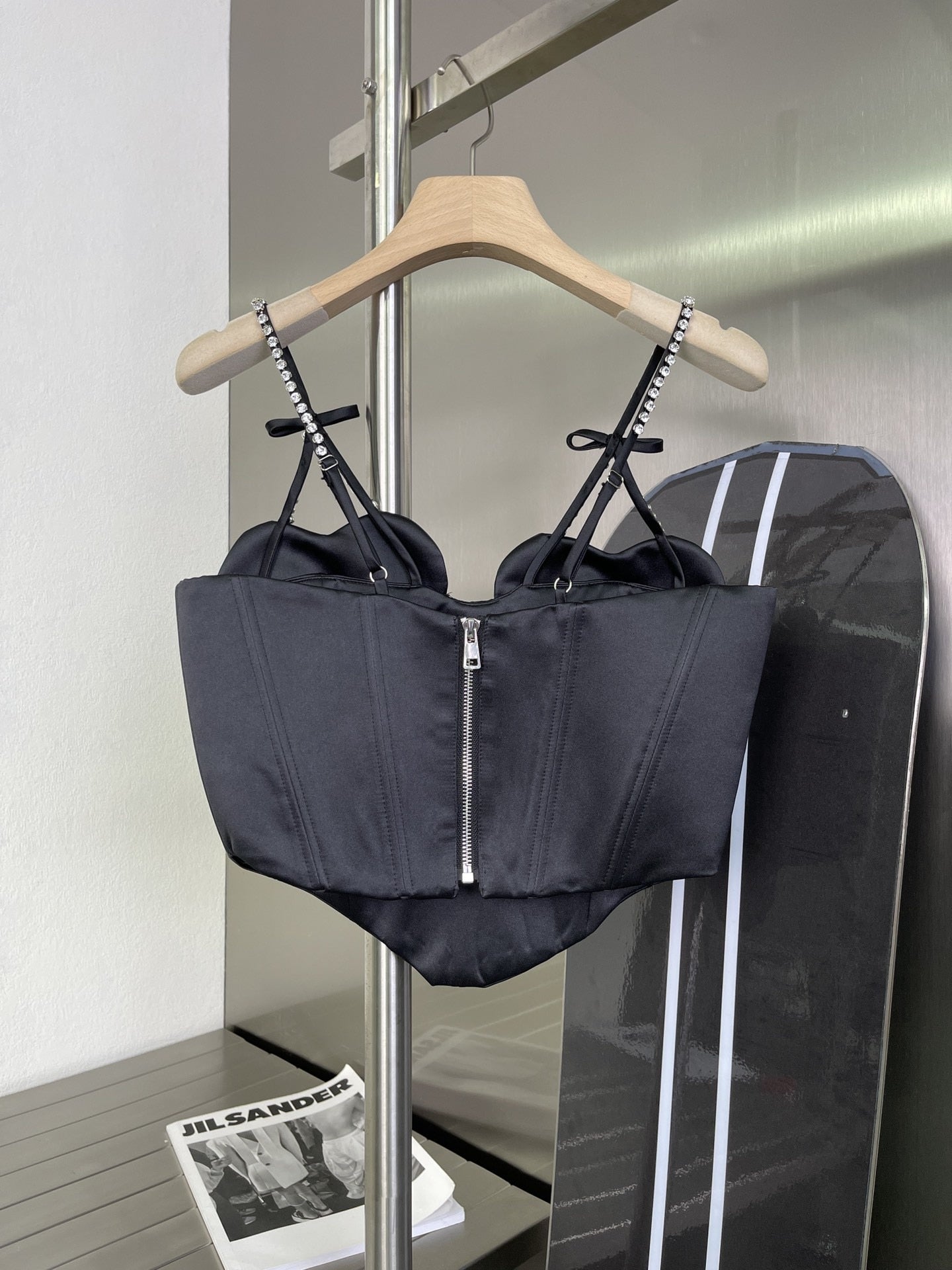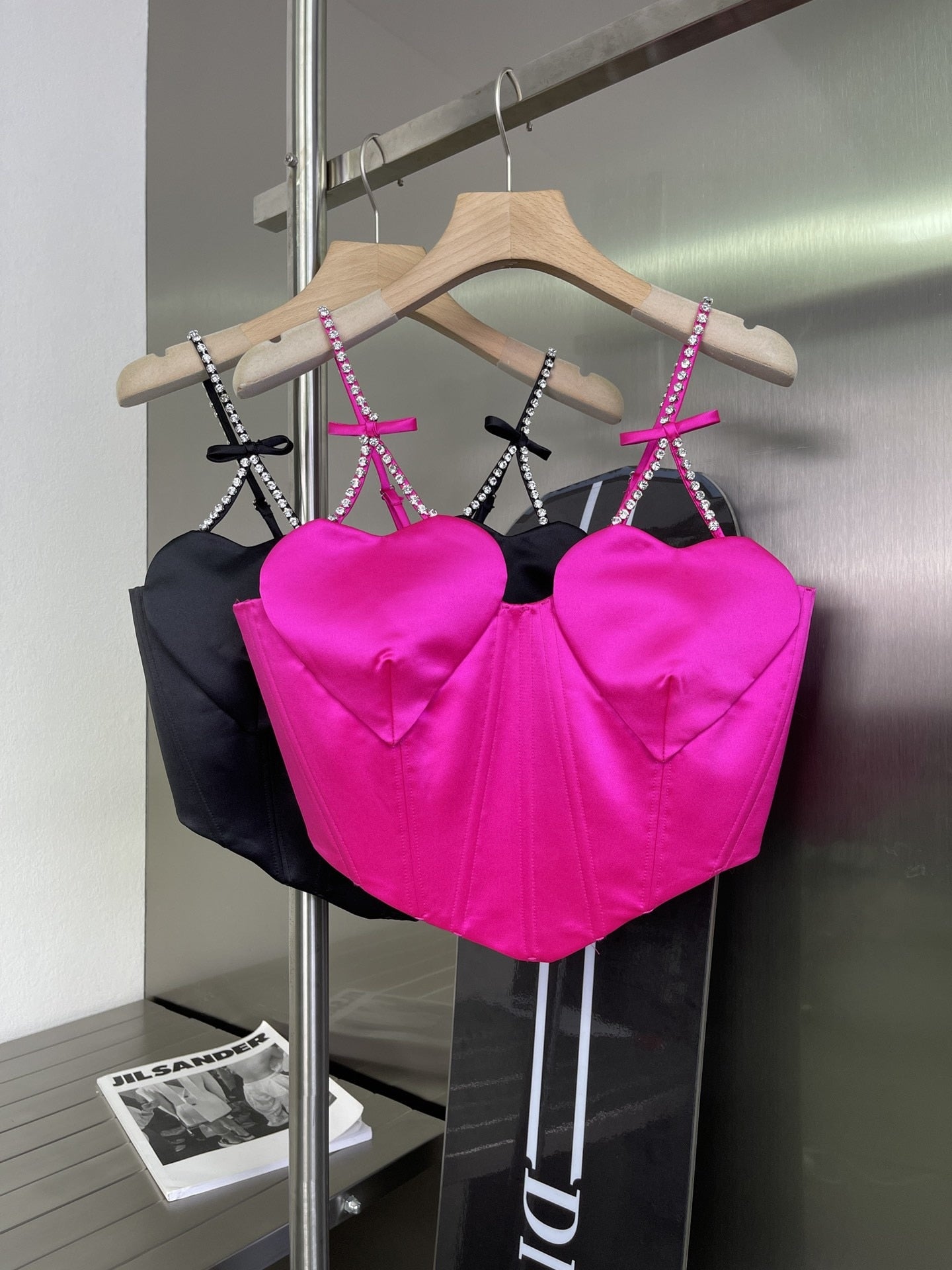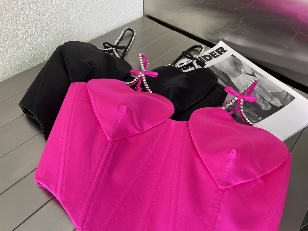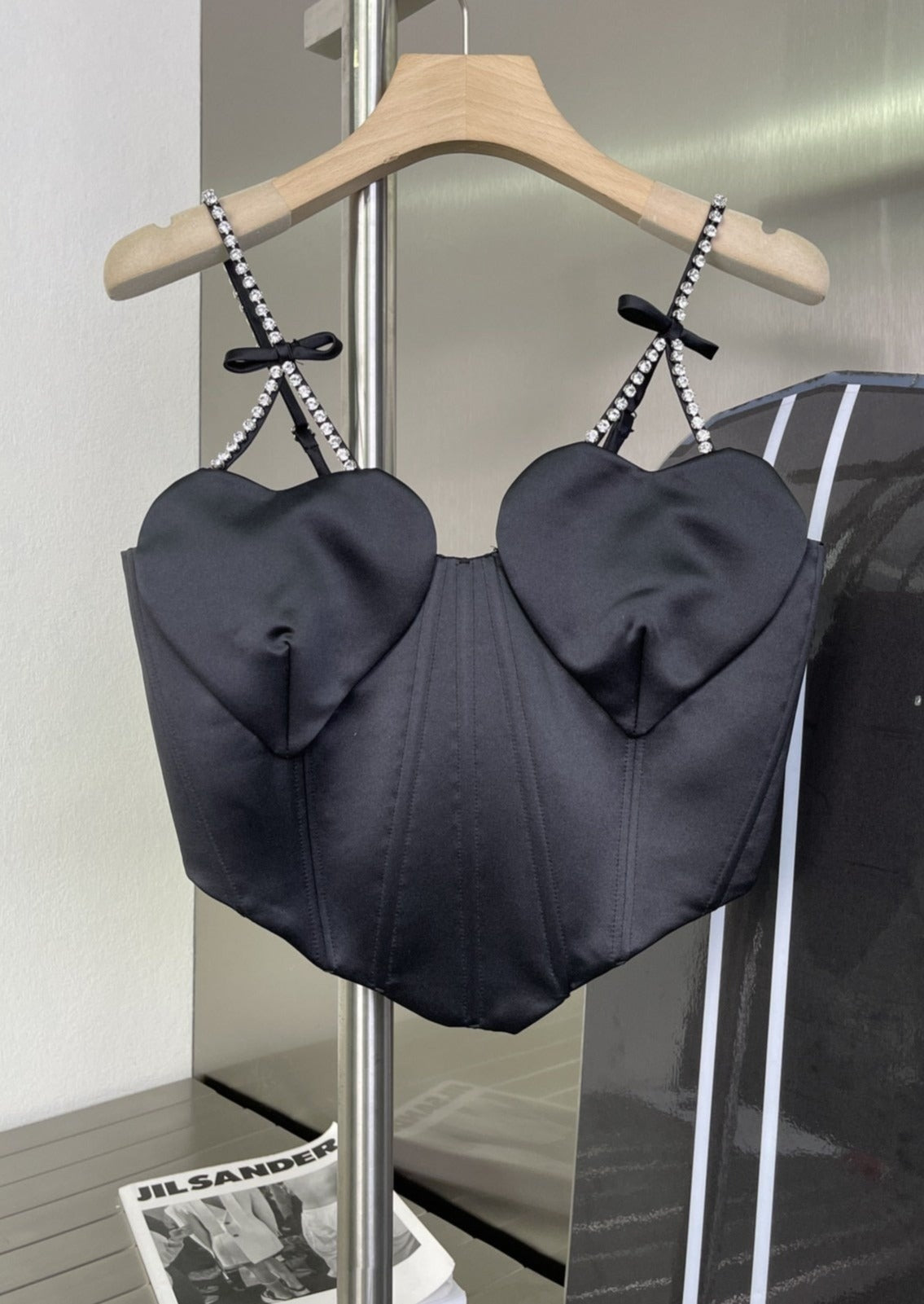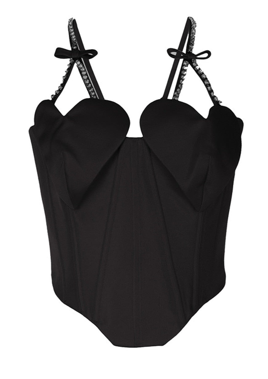 Blak Diamond & Hearts Top is made in the form of a corset. The thin straps are decorated with rhinestones and bows. Sconces are made in the form of big hearts for a very romantic and seductive image. Zipper at the back.