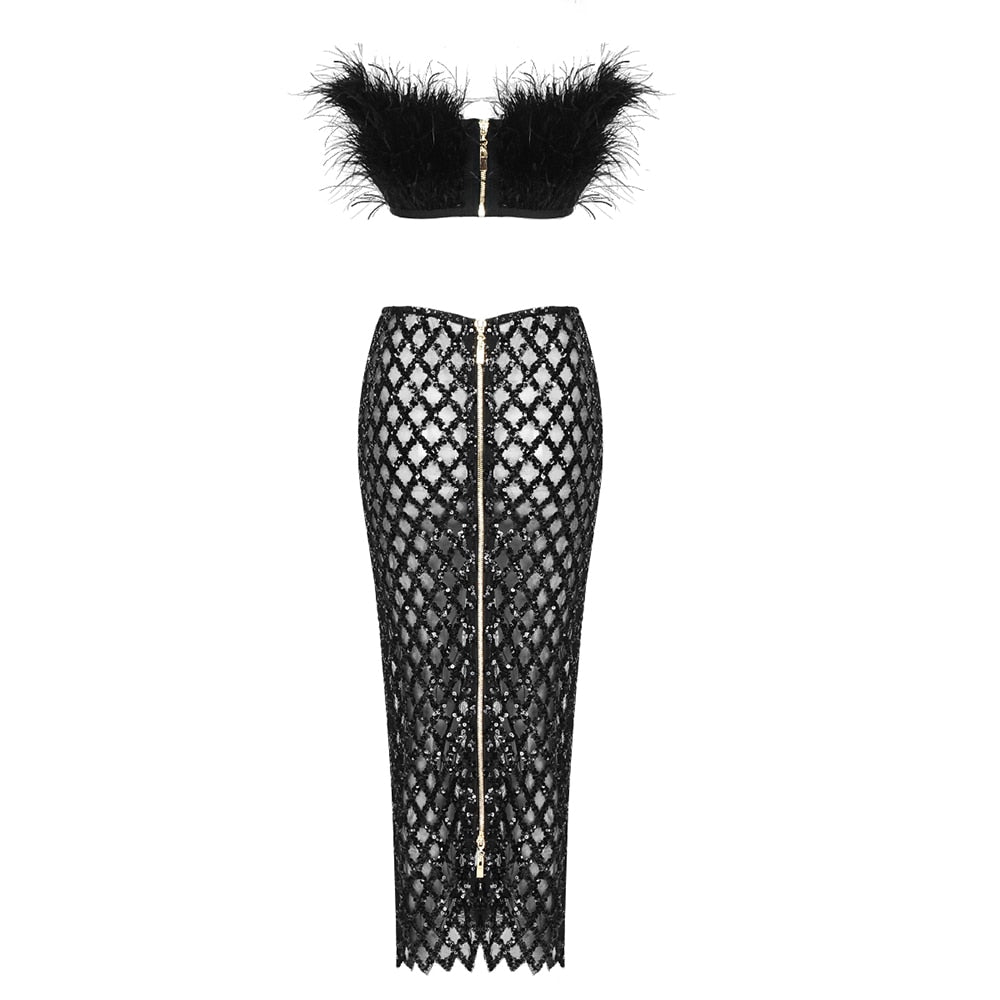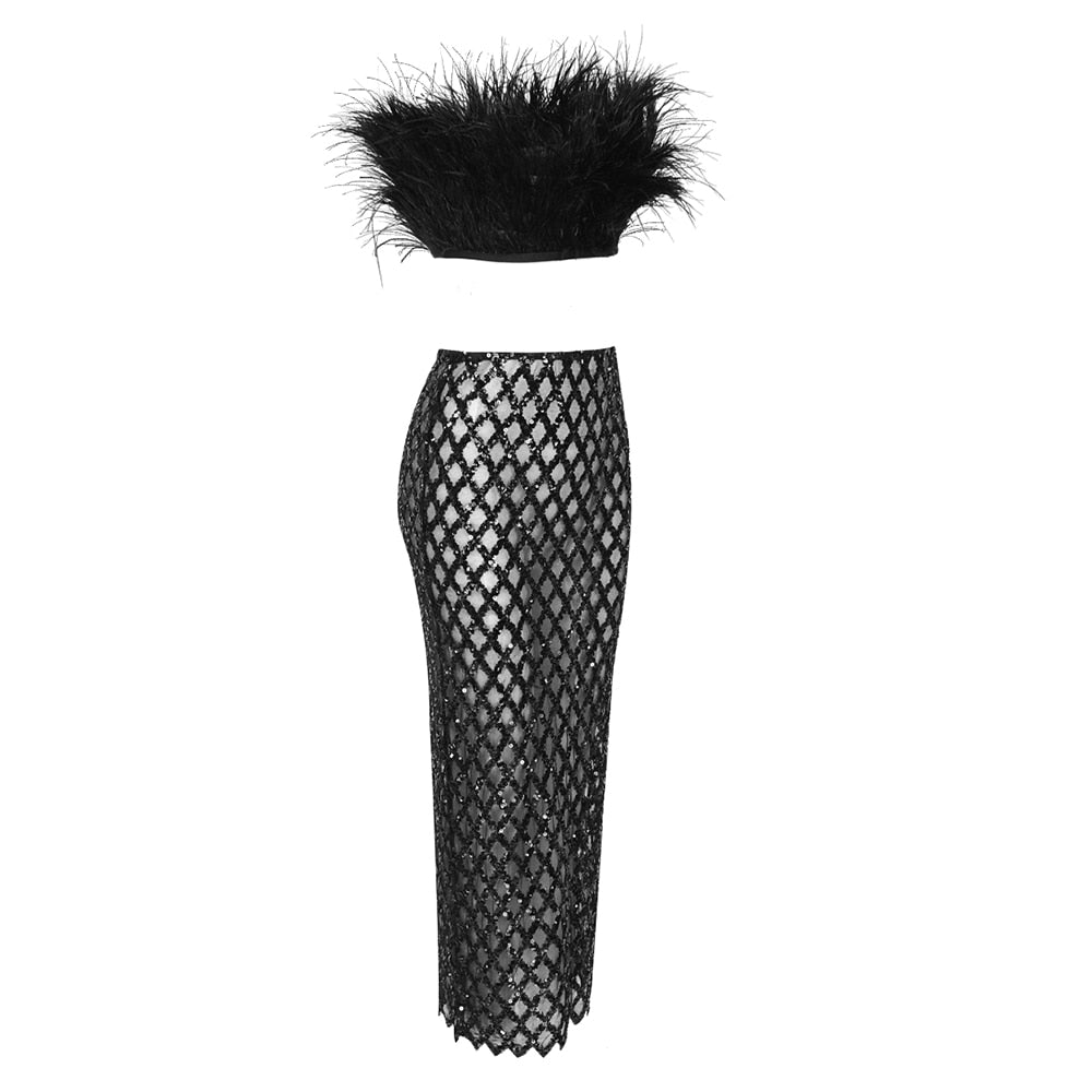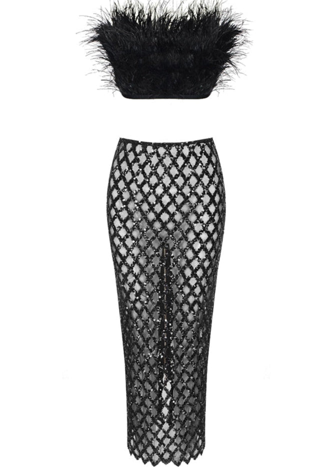 This stunning Black Two-piece Set with Feathers and with a matching sequin maxi skirt. Style this beautiful set with your favorite heels for a sophisticated look!