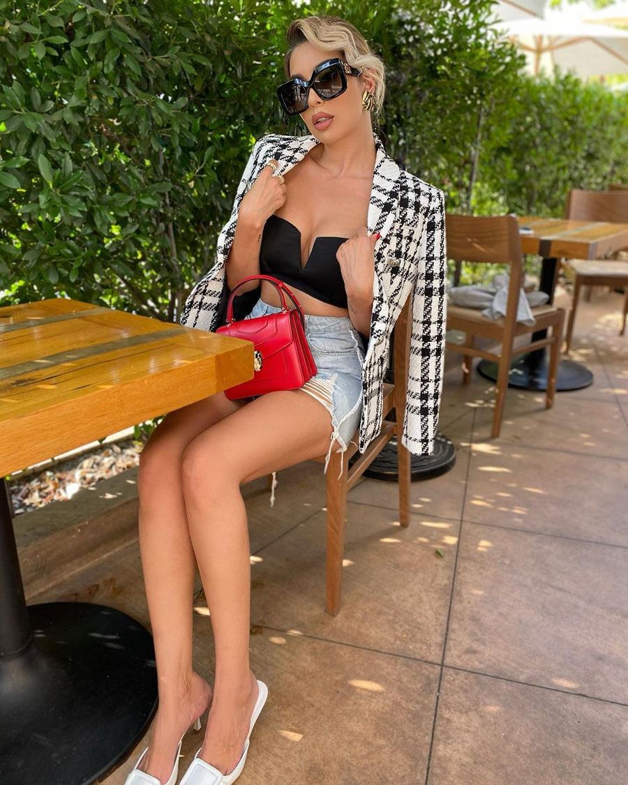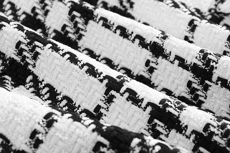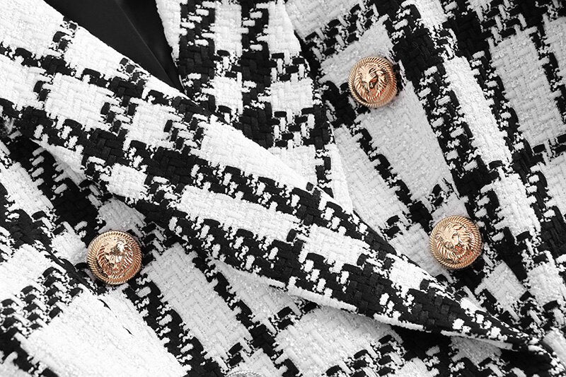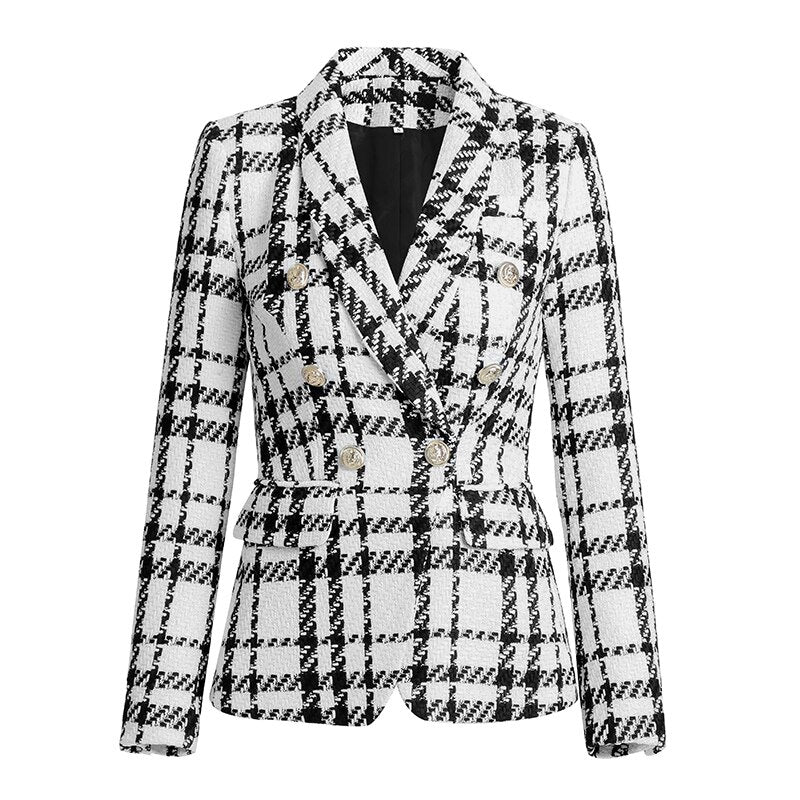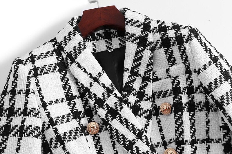 Our Plaid Black and White Blazer is a must have in your wardrobe. Featuring a double breasted fit with lion buttons for extra detail. On the lining. Style with your favorite pants for a chic look! Stylish outfit for the office.