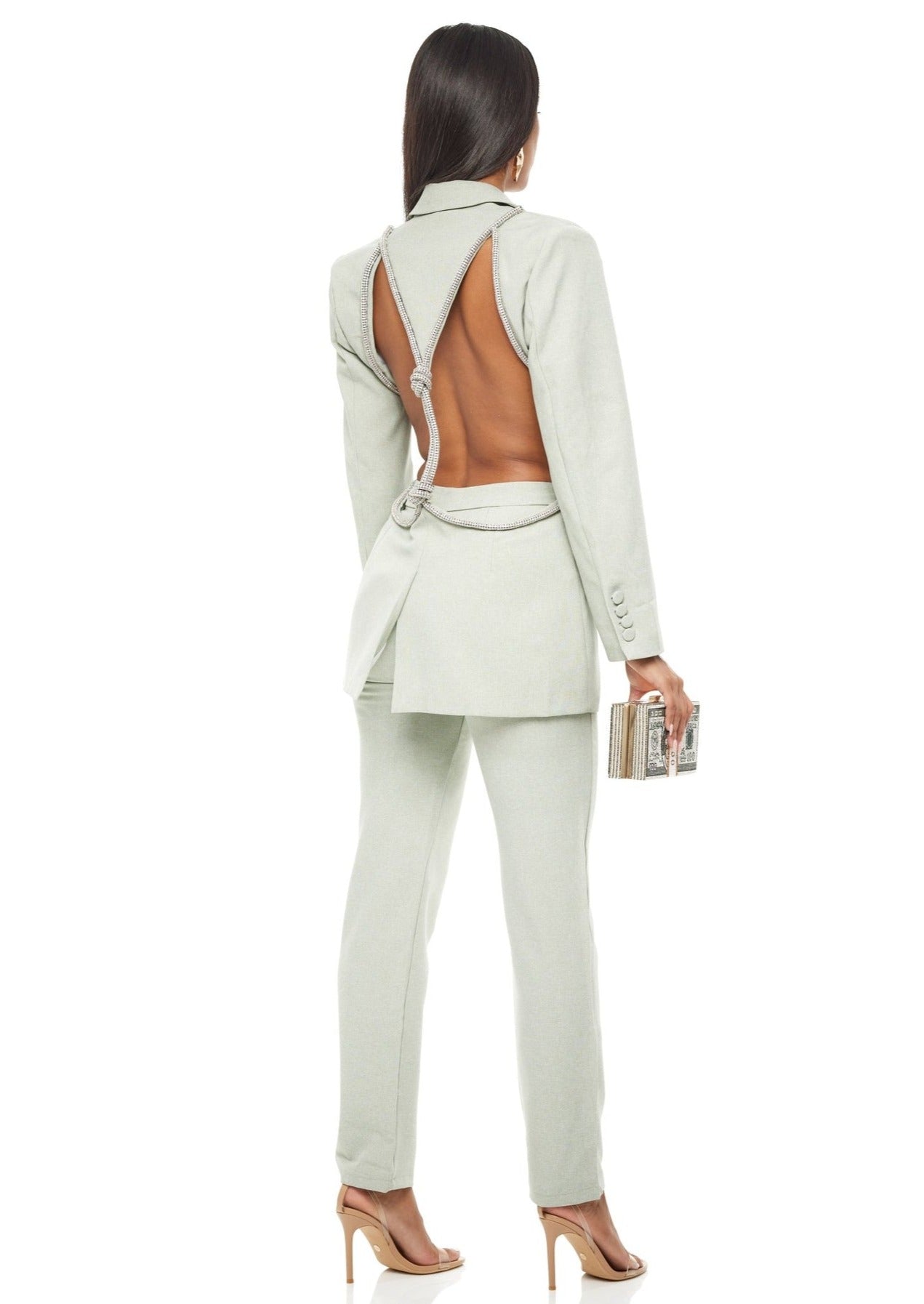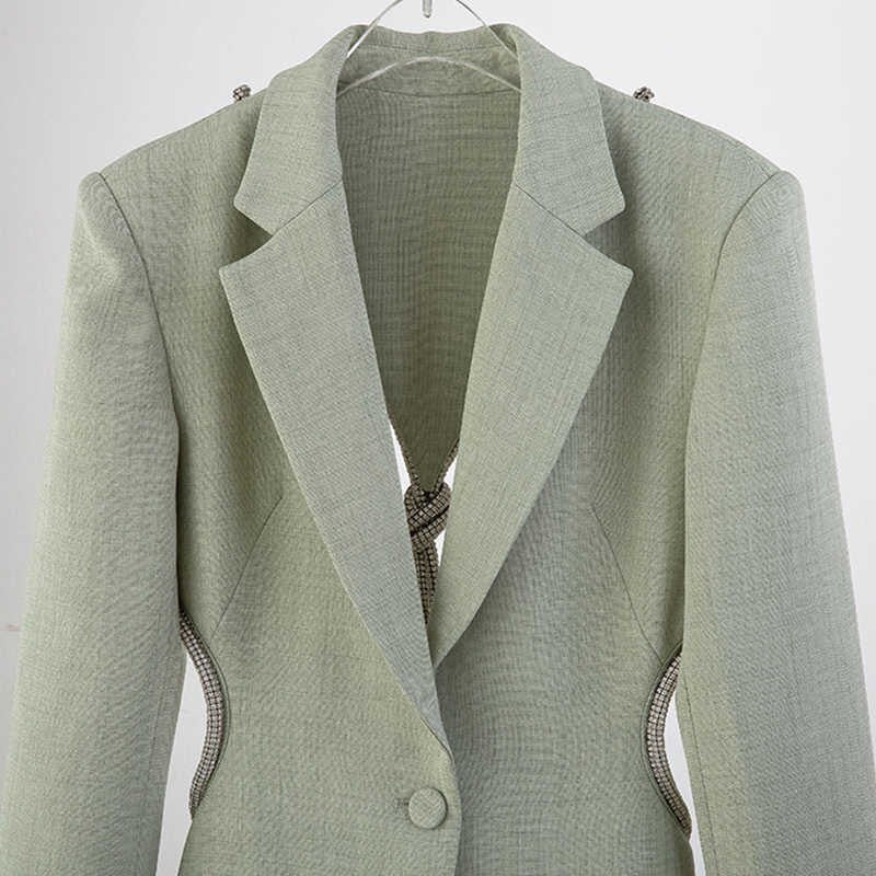 Look all kinds of glam in this unreal Green Backless Diamond Blazer. Featuring a lapel collar, backless design, with diamond detailing and hollow out sides, we're in love. Wear with black biker shorts underneath, a statement bag, and finish it off the look by pairing it with satin diamond heels. You can't forget your earrings to pull everything together as featured.
