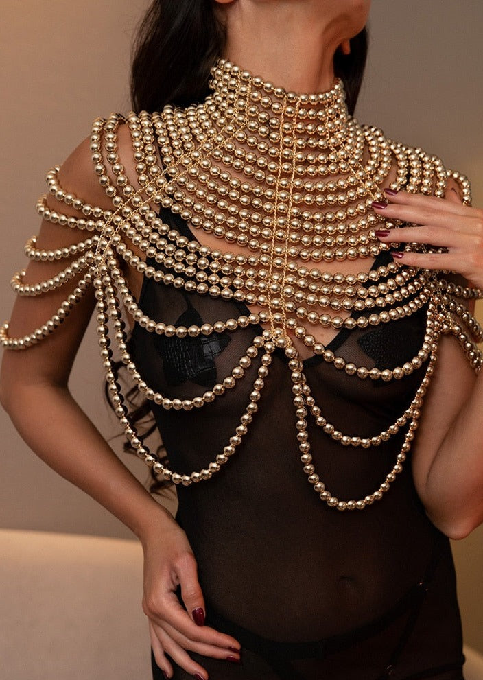 Get ready to look super chic in our Gold Pearl Necklace. Featuring oversized layered pearls from neckline to shoulders. Layer over your favourite dress for a chic look!