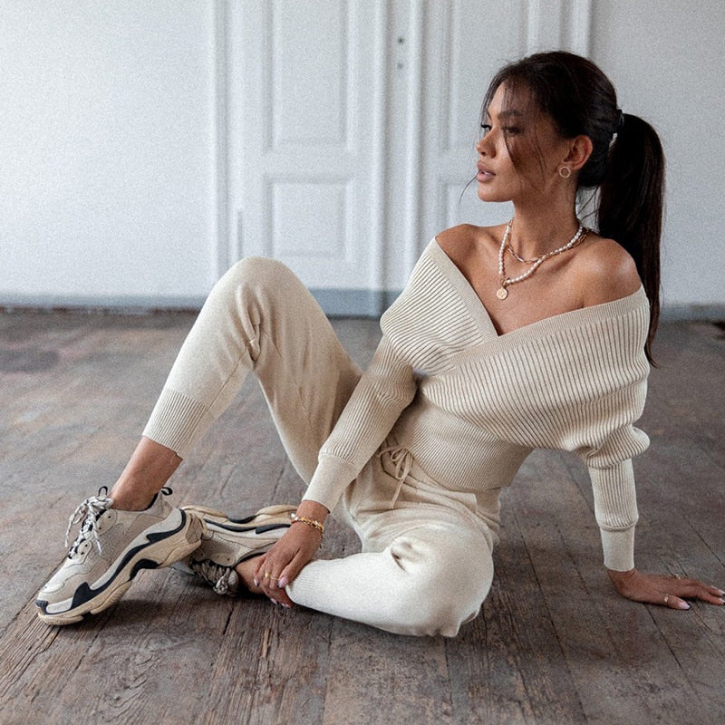 Soft comfortable ribbed Knitted Two-Piece Set with Off-the-shoulder Top is ideal for walking in the cool summer, autumn or spring. V-neck top with long sleeves and open shoulders. Tight pants emphasize the figure. The pants have ties and pockets in the front.