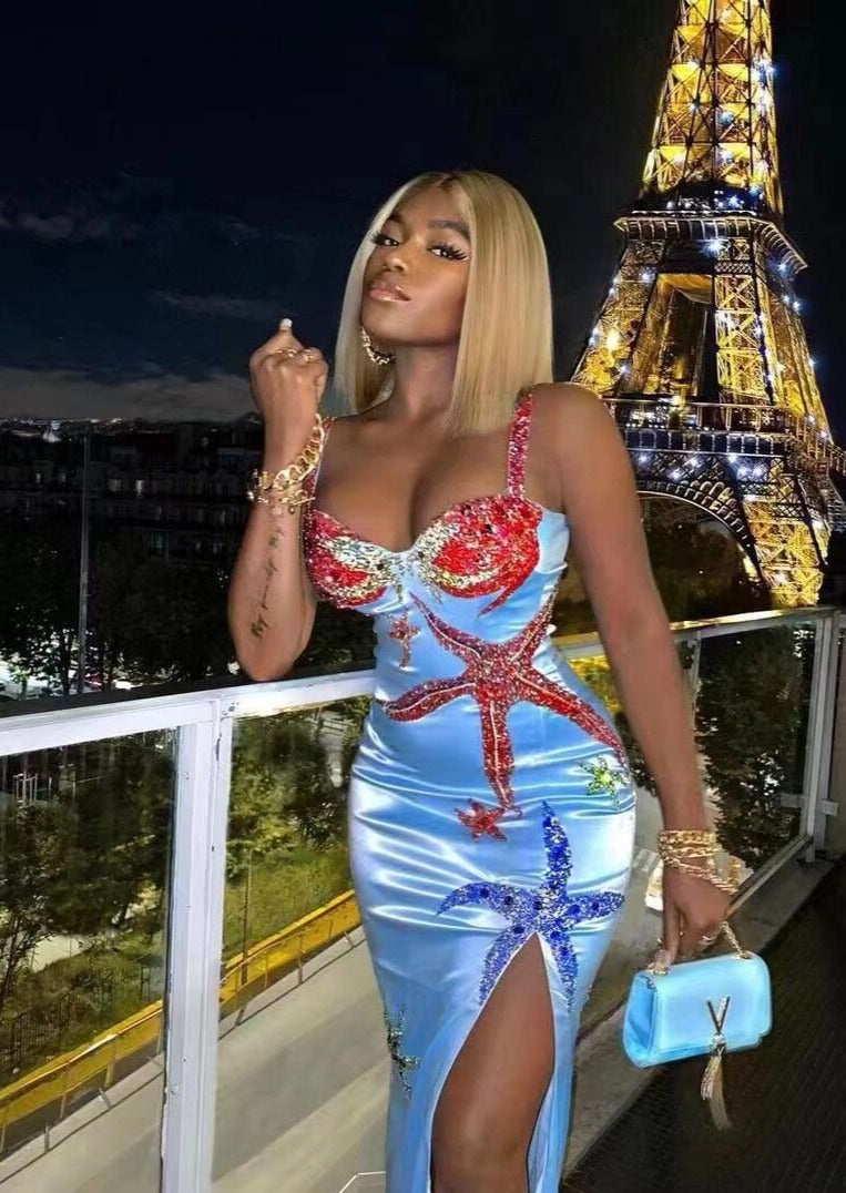Get ready to stand out with our Maxi Dress with Starfishes! Front slit. Zipper at the back. On the straps. Featuring sequin details. Style with heels for a look we're obsessed with!