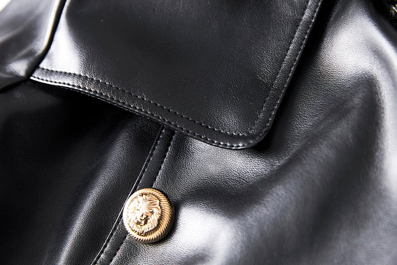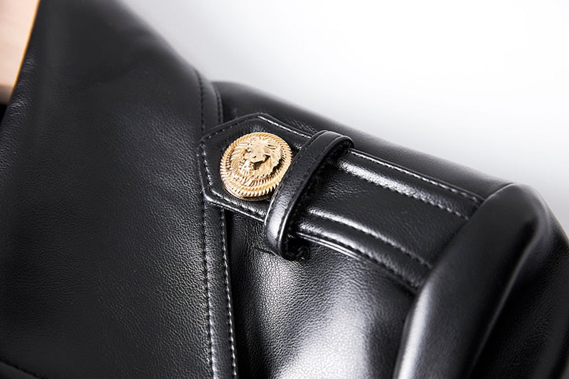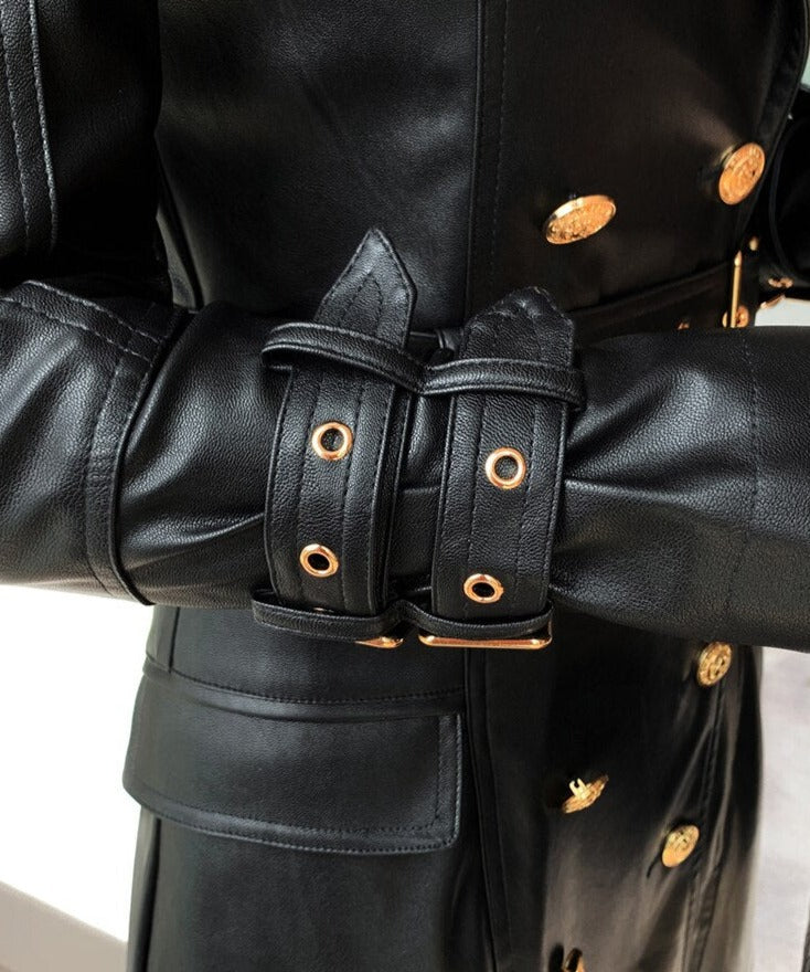 Bold gold-tone buttons embellish the classic black design of this leather double-breasted coat. Double-belted cuffs are fastened with golden buckles, as well as a belted waist. Storm flap, notched lapels, double-breasted button fastening, belt loops. Belted waist. Long sleeves. Belted cuffs. Two zip-fastening pockets. Below-knee length.