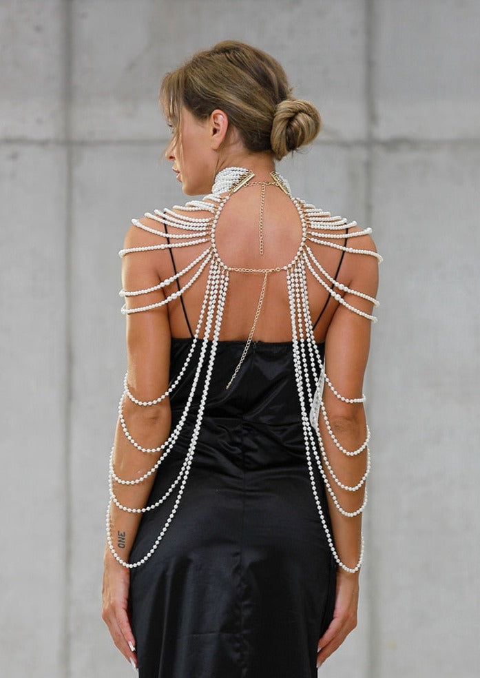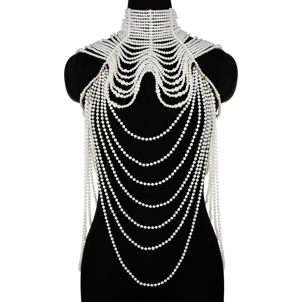 In our Pearl Chains Necklace you will be the brightest star at any event, such as Club, Party, Wedding, Celebrity Evening, Cocktail, Red carpet, or Concert. This accessory will complement any outfit and set you apart from the crowd. Featuring oversized layered pearls from neckline to shoulders. Layer over your favorite dress for a chic look!