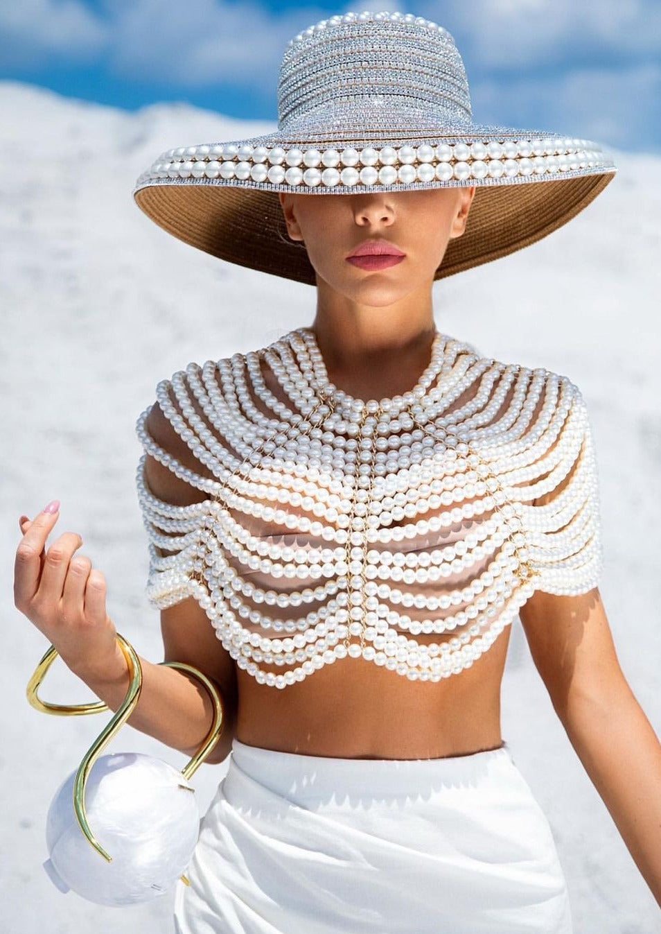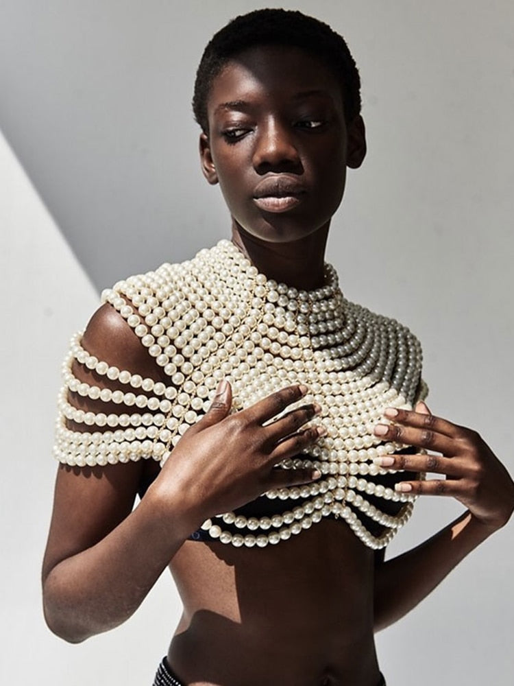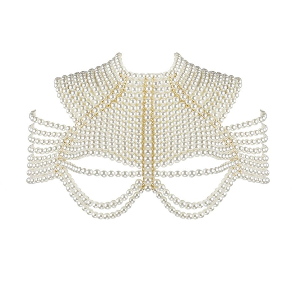 Get ready to look super chic in our Pearl Necklace. Featuring oversized layered pearls from neckline to shoulders. Layer over your favourite dress for a chic look!