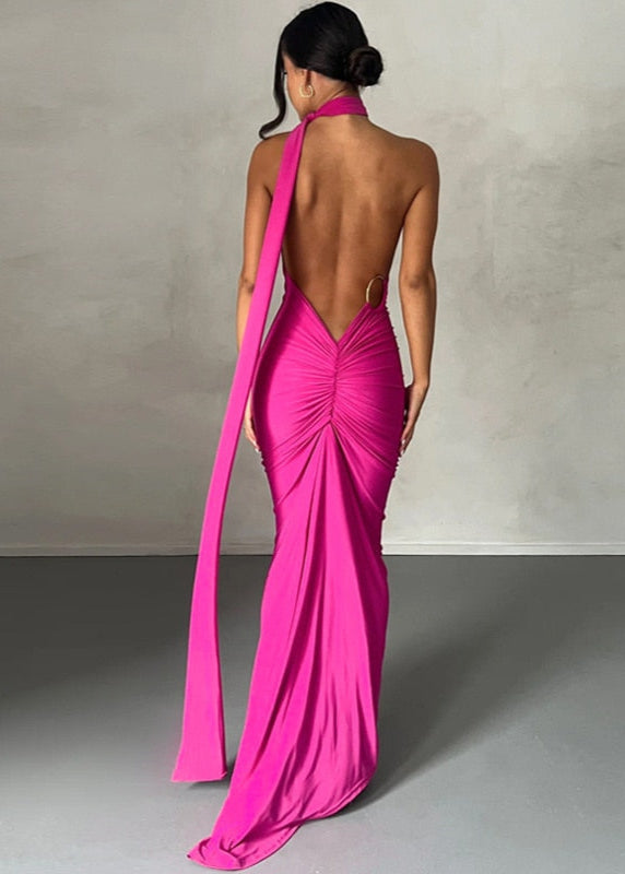 Pink Draped Maxi Dress with Asymmetrical Neckline