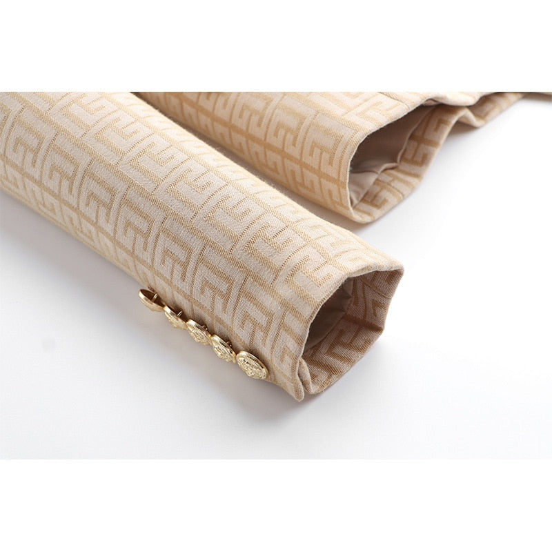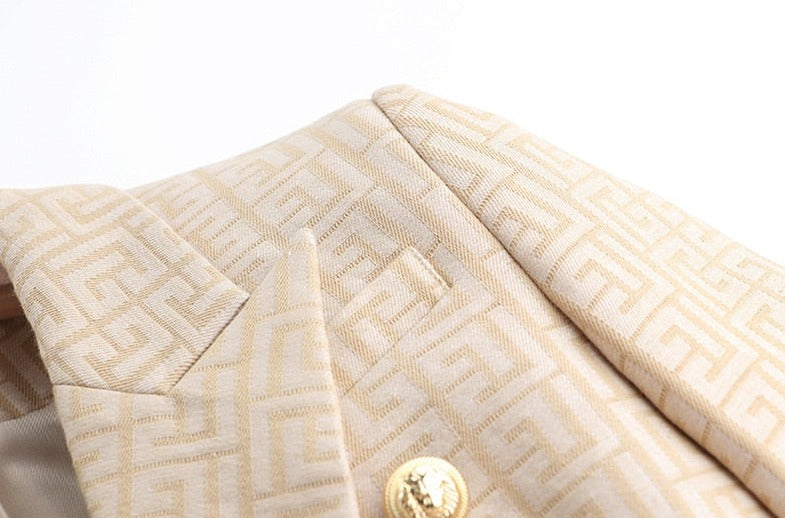 Double-breasted Texture Blazer is decorated with gold buttons. On the lining. Flap pockets on the front.