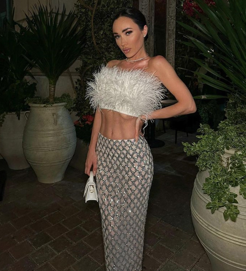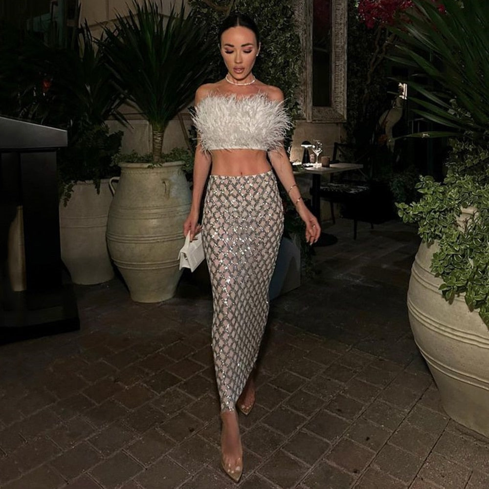 This stunning Two-piece set with Feathers and with a matching sequin maxi skirt. Style this beautiful set with your favorite heels for a sophisticated look!
