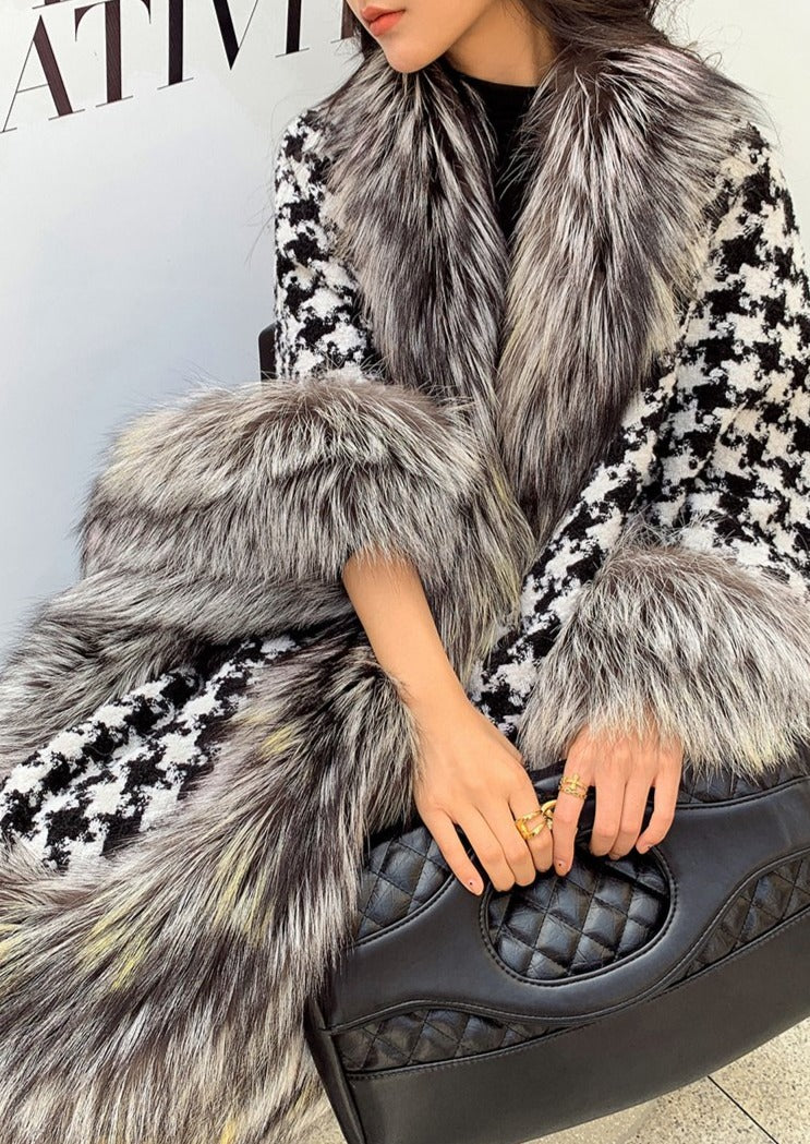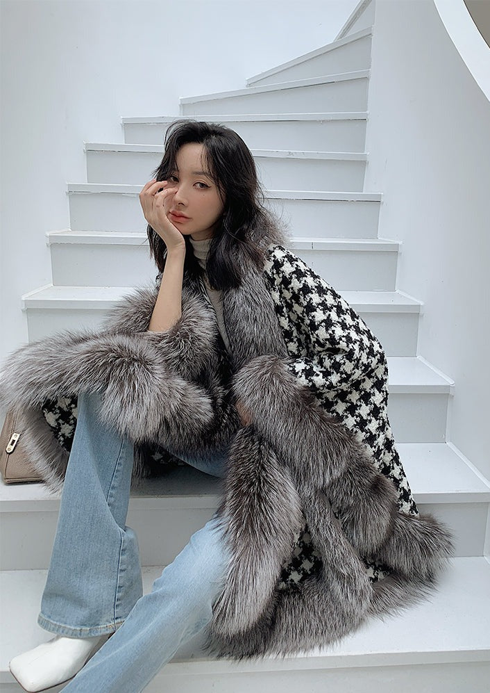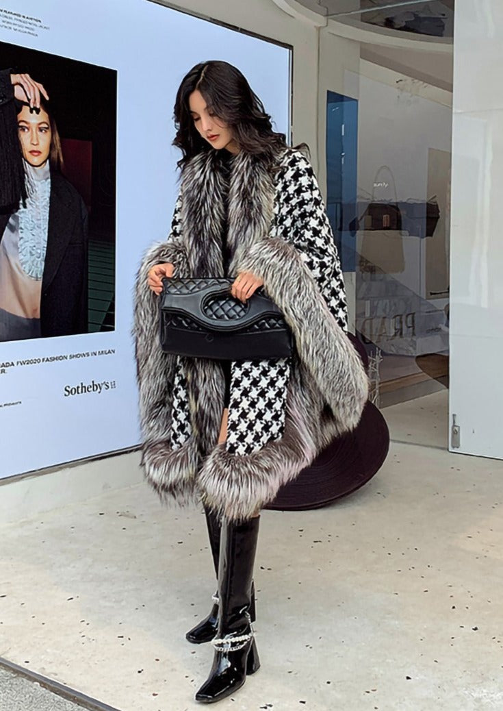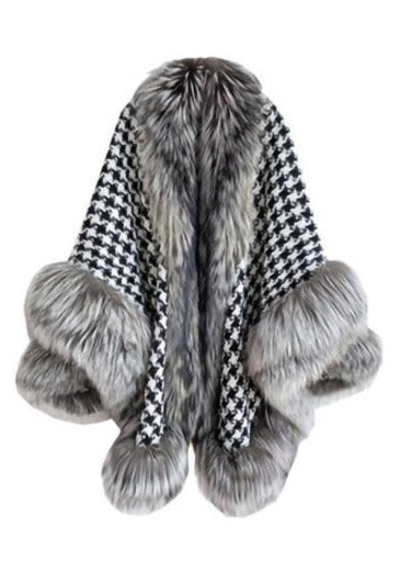 Fox Fur Trimmed Houndstooth Poncho